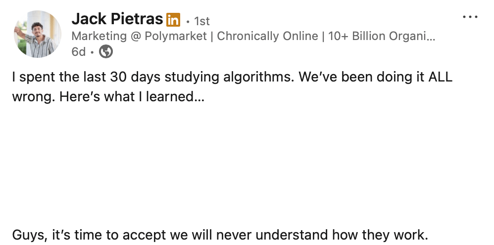 One of the biggest mistakes that social media professionals make is overobsessing about the algorithm. When in reality, there are thousands of iterations of ‘algorithms’ as they are constantly evolving and trying their best to serve you content that they think would interest you. We’ll never understand how they work, but what we can understand is who our consumers are. Focus more on your consumers and people, and the algorithms will do their job. This is a great post by Jack - also pretty funny. Make sure to go give Jack a follow on LinkedIn!