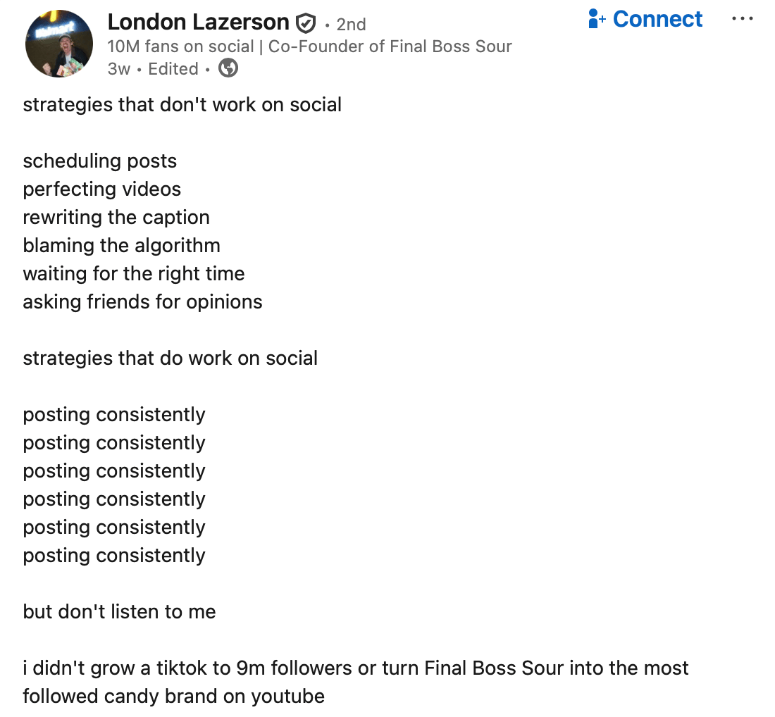 Being “consistent” is one of the most unsexy truths about social media and building a winning social media strategy. Do the simple things well, and let your efforts compound over time. Keep shooting your shot and keep showing up. This was such a great post by London. Make sure to go give London a follow on LinkedIn!