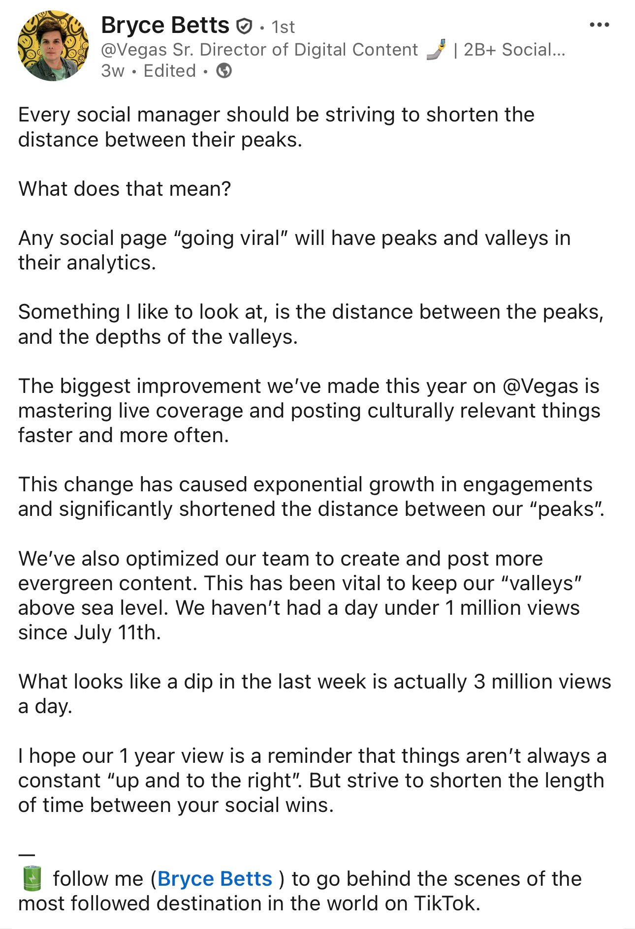 As social media professionals, we must be data-driven and inspired by data. Every post, interaction, and strategic implementation must be based on data. However, one thing your analytics can tell you is the distance between your peaks and spikes in performance. Bryce is an absolute legend and hits on this so well in this LinkedIn post. Make sure to go give Bryce a follow on LinkedIn!